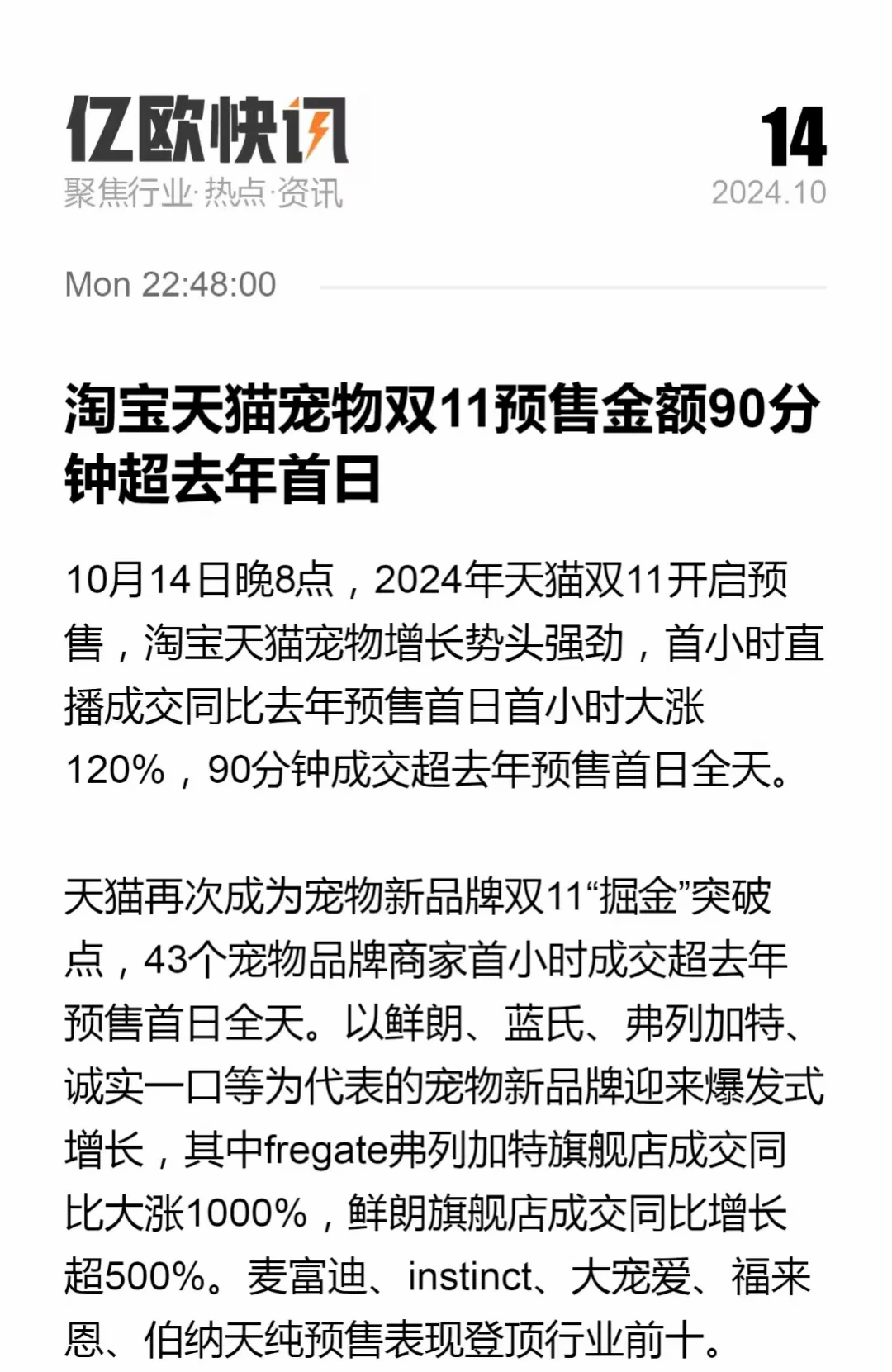 在剛剛拉開帷幕的2024年雙11,寵物也不負眾望,繼續(xù)引領(lǐng)著巨大增長。