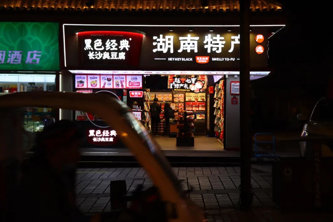 在坡子街人流巨大的街道網(wǎng)絡(luò)中,幾乎每隔兩三百米就有一家黑色經(jīng)典門店,做到了讓每個(gè)游客都幾乎無法忽視,而在居民區(qū)的街巷,則很少能看到黑色經(jīng)典,更多都是傳統(tǒng)的、單獨(dú)門店的小型品牌,甚至家庭作坊式的臭豆腐攤。