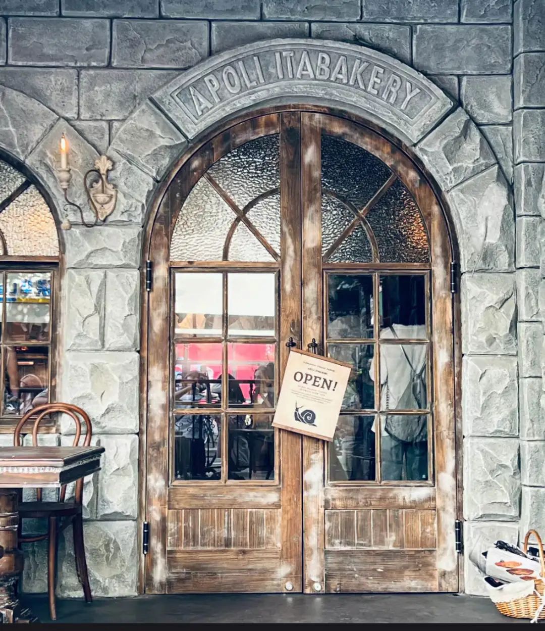 同樣的開放式面包柜臺(tái),石頭墻上纏繞著枝條與干花,輔助暖色燈光,營造出故事書里的魔法面包店。
