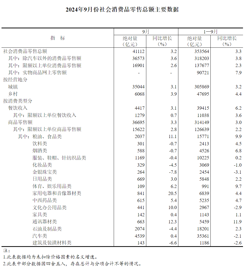 2024年9月份社會(huì)消費(fèi)品零售總額主要數(shù)據(jù)