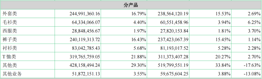 值得一提的是,收入貢獻(xiàn)排在第一位的其他類中主要包含男士?jī)?nèi)衣、內(nèi)褲、襪子及其它針紡產(chǎn)品等,這意味著夾克品類貢獻(xiàn)的收入還不如男士?jī)?nèi)衣、內(nèi)褲等品類貢獻(xiàn)的收入多。