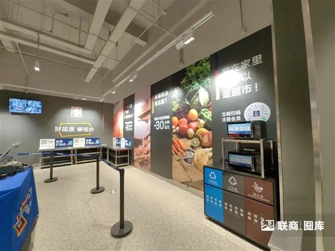 賣場內外,“免費注冊會員、立享開業(yè)優(yōu)惠”“微信小程序購物,最快30分鐘送達”“窩在家里也可以逛超市”的標語清晰可見。