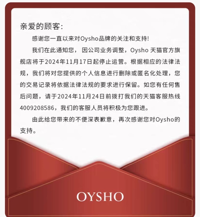 OYSHO在天貓旗艦店發(fā)布公告稱,因業(yè)務調整,OYSHO天貓旗艦店將于11月17日起停止運營。