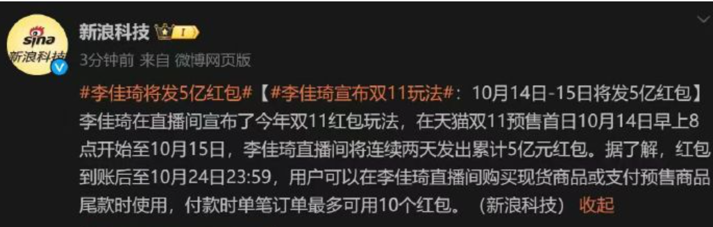 圖:李佳琦將發(fā)5億紅包的媒體報(bào)道。來源:新浪科技微博