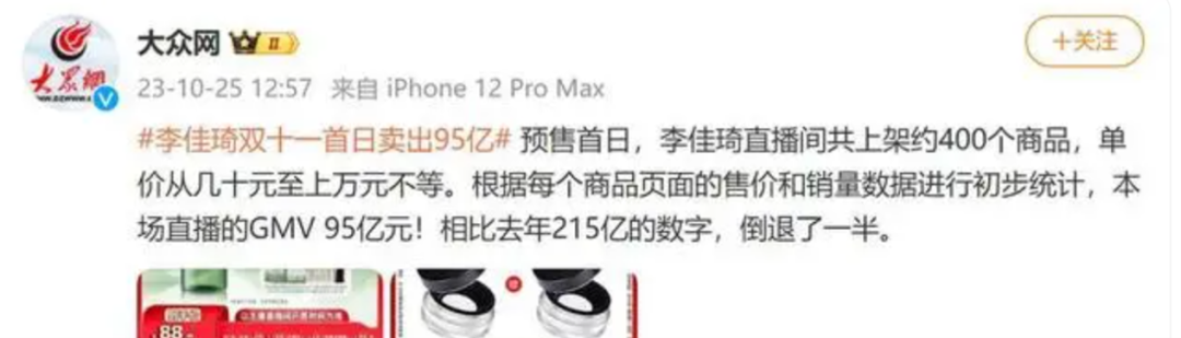 據(jù)多家媒體報(bào)道,2023年雙11首日,李佳琦直播間銷售額為95億元,和2022年同期相比,減少一半以上,創(chuàng)下過去3年新低;而今年618,李佳琦直播間預(yù)售同比又下降了46%。