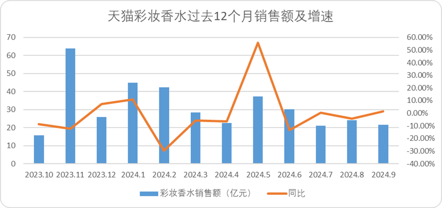 圖:天貓護(hù)膚個(gè)護(hù)及彩妝香水一年間銷售表現(xiàn),來源:青眼數(shù)據(jù)