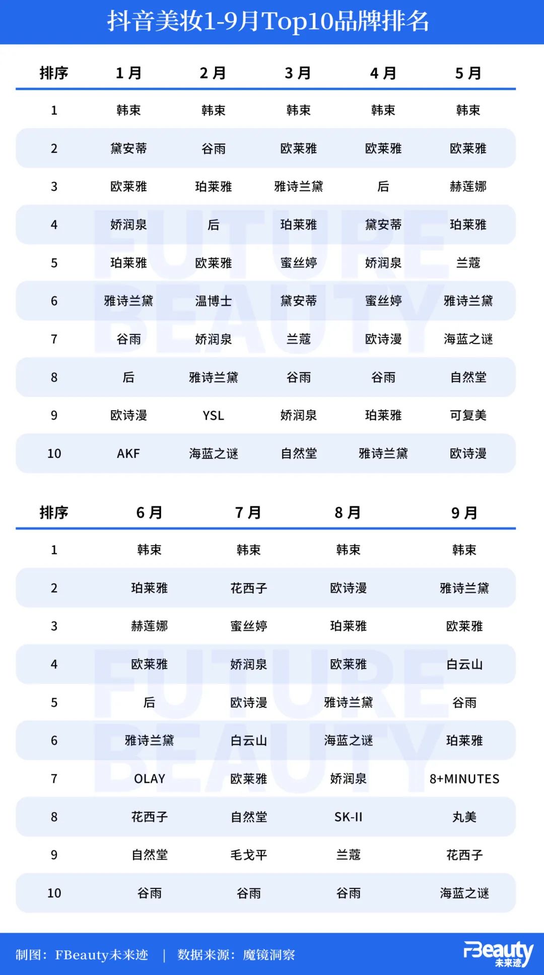 而在抖音平臺,韓束以超過47億GMV形成斷層優(yōu)勢,連續(xù)9個(gè)月成為抖音美妝全品類第一,Top3的其他兩個(gè)品牌分別有黛安蒂、谷雨、歐萊雅、珀萊雅、赫蓮娜、后、花西子、蜜絲婷和雅詩蘭黛上榜,但韓束一直“遙遙領(lǐng)先”。