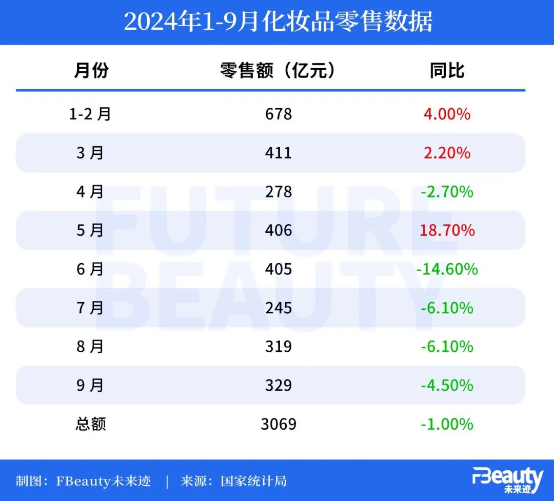 其中化妝品9月單月賣出329億元,同比下滑4.5%,自6月以來已經(jīng)連續(xù)下滑4個(gè)月;前9月總計(jì)零售3069億元,同比也下滑了1%。