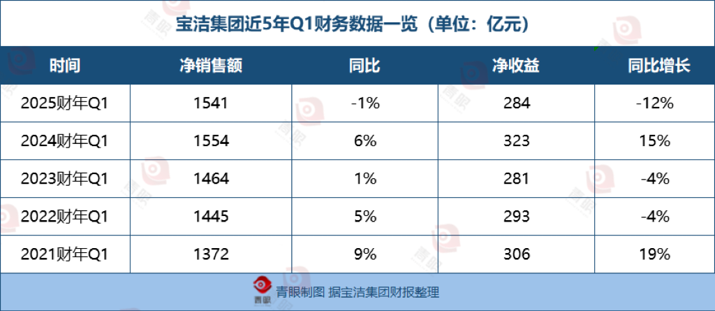 據(jù)最新財(cái)報(bào)顯示,2025財(cái)年第一季度,寶潔凈銷售額達(dá)1541億元,同比下滑1%; 凈利潤為284億元,同比下滑12%。 另據(jù)青眼梳理發(fā)現(xiàn),通過對比近5年來的Q1業(yè)績,寶潔首次出現(xiàn)凈銷售額、凈利雙雙下滑的局面,特別是凈銷售額也為其5年來首次下滑。
