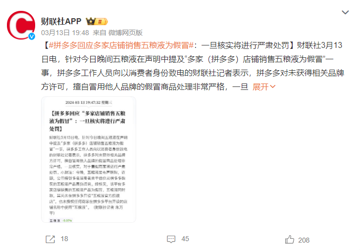 10月18日,劍南春發(fā)布了一封《致劍南春消費者的告知書》。告知書中表明,劍南春近來收到了多位消費者的反饋,稱對在電商平臺補貼購買的52度水晶劍南春(550ML、558ML)存疑。而劍南春調(diào)查后發(fā)現(xiàn),這些消費者所提供店鋪的劍南春授權(quán)書均系偽造。經(jīng)過對各電商平臺補貼的多個店鋪銷售的水晶劍南春采樣、核查,劍南春初步認(rèn)定,采樣的水晶劍南春來源復(fù)雜,疑似為回收拼湊銷售。