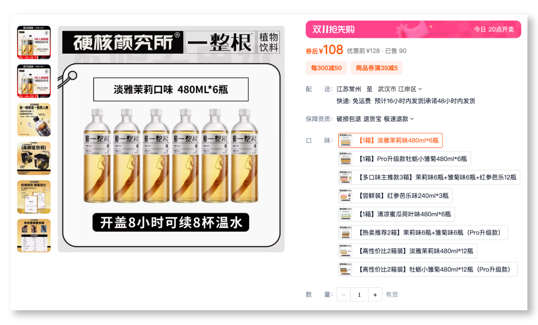 據(jù)驚蟄研究所觀察,目前“一整根”人參水產(chǎn)品在淘寶平臺的價格區(qū)間為13元到25元,市面上主打養(yǎng)生的現(xiàn)制茶飲單價也基本上在20元上下,僅從定價上看,二者價格都偏高;反觀主打“家!钡闹惺金B(yǎng)生水,大多數(shù)品牌500ml規(guī)格的產(chǎn)品標價普遍為每瓶4元到5元。