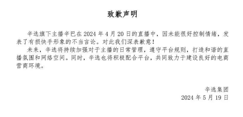 隨后,辛巴本人和辛選旗下多位主播的直播間被封。此后,辛巴的賬后一直處于封禁狀態(tài)。5月19日,辛選集團向快手發(fā)布了道歉聲明。