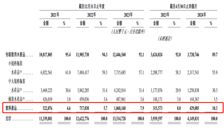 相較之下,盡管華潤(rùn)飲料在招股書(shū)中提到公司涉足碳酸飲料、茶飲料、運(yùn)動(dòng)飲料等多個(gè)領(lǐng)域,并建立了13個(gè)品牌推出59款SKU,但招股書(shū)中,上述多元化嘗試因?yàn)樨暙I(xiàn)太少,也只能歸于“飲料產(chǎn)品”大類,反倒是品類更單一的飲用水分成了3個(gè)子類目。