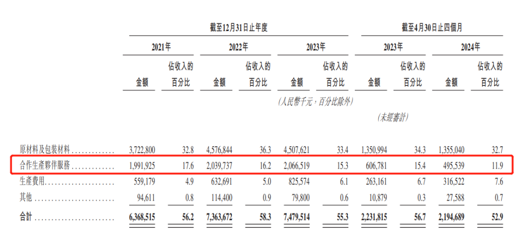 2021-2023年,怡寶向代工廠支付了19.92億元、20.4億元、20.67億元,分別占總營(yíng)收的17.6%、16.2%、15.3%。
