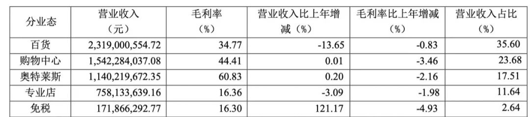 王府井在財(cái)報(bào)中指出:上半年公司旗下購(gòu)物中心業(yè)態(tài)發(fā)揮大體量、多元業(yè)態(tài)優(yōu)勢(shì),強(qiáng)化高品質(zhì)體驗(yàn)新資源引進(jìn),有效增強(qiáng)集客能力,面對(duì)艱難的市場(chǎng)環(huán)境,營(yíng)業(yè)收入同比基本持平,同時(shí),受消費(fèi)結(jié)構(gòu)轉(zhuǎn)變的影響,購(gòu)物中心業(yè)態(tài)收入占公司營(yíng)業(yè)收入的比重進(jìn)一步提升,達(dá)23.68%;奧特萊斯業(yè)態(tài)加強(qiáng)高性價(jià)比經(jīng)營(yíng)內(nèi)容的組織與運(yùn)營(yíng),持續(xù)深化營(yíng)銷活動(dòng),營(yíng)業(yè)收入同比小幅上升,業(yè)態(tài)占比達(dá)到17.51%;百貨業(yè)態(tài)門店持續(xù)深化轉(zhuǎn)型,強(qiáng)化資源支撐打造精品百貨特色,但受商品消費(fèi)低迷、消費(fèi)習(xí)慣變化以及公司門店轉(zhuǎn)型調(diào)整的影響,營(yíng)業(yè)收入同比下降13.65%,業(yè)態(tài)占比下降至35.6%。