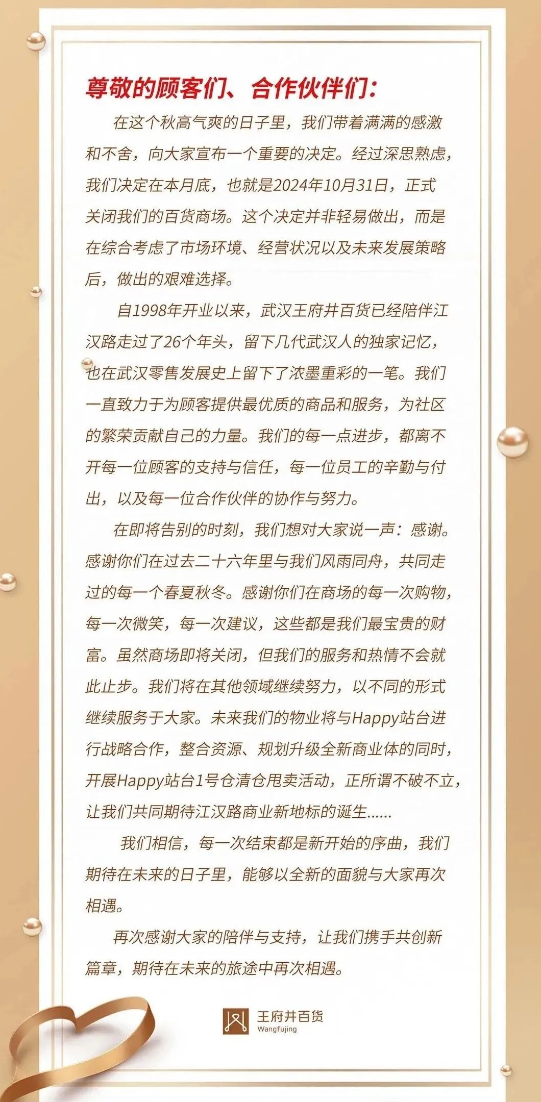 近日,武漢王府井百貨發(fā)文宣布告別,這已經(jīng)是它扎根武漢的第26年。