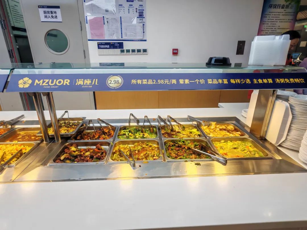 而自選稱重菜品,是2.98元每兩,葷素一個價,主食要單選,主食在3-5元左右。