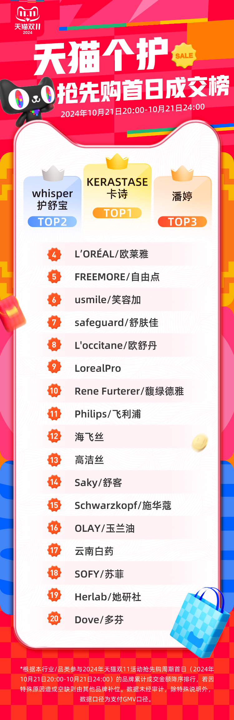在個(gè)護(hù)榜單方面,預(yù)售首日排名第1的潘婷被排名第2的卡詩取代,潘婷排名降至第3。歐萊雅、馥綠德雅、海飛絲、施華蔻、玉蘭油、多芬等品牌排名下滑,而原在榜單開外的歐舒丹在搶先購(gòu)首日榜單中排名第8。