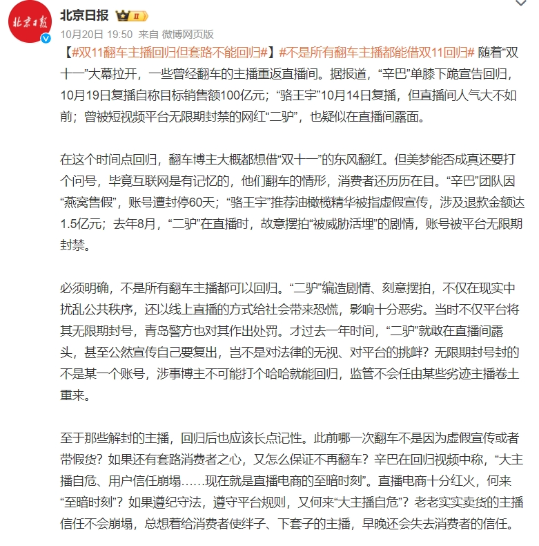 但經(jīng)過(guò)多年的發(fā)展,網(wǎng)紅主播在直播間里高聲吶喊的場(chǎng)景,已經(jīng)很難再輕易打開消費(fèi)者的錢包,直播電商行業(yè)也正在進(jìn)入的新轉(zhuǎn)折點(diǎn)。尤其是今年“雙11”前夕,三只羊、東北雨姐等多名直播電商頭部主播接連“翻車”,導(dǎo)致直播電商行業(yè)遭遇了嚴(yán)重的“信任危機(jī)”;如何讓直播電商生態(tài)持續(xù)健康發(fā)展,成為了行業(yè)亟待解決的問(wèn)題。