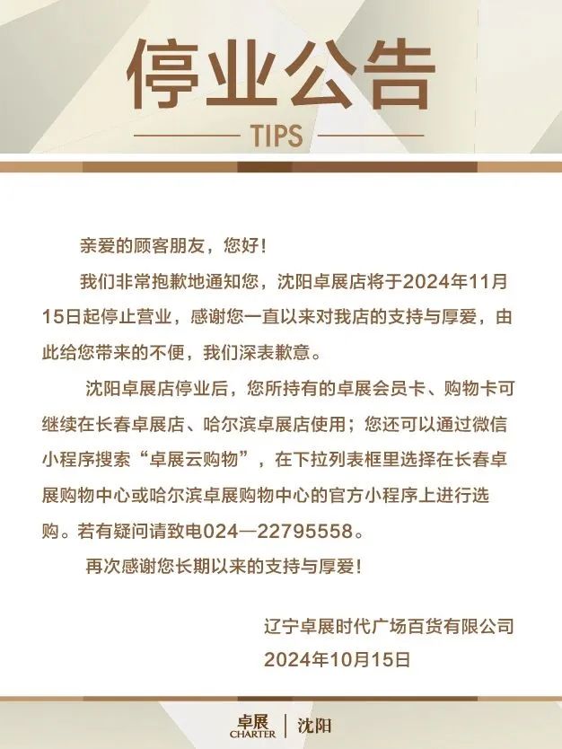 10月15日,沈陽高端百貨卓展購物中心(以下簡稱“沈陽卓展”)發(fā)布公告稱,門店將于11月15日正式停業(yè)。