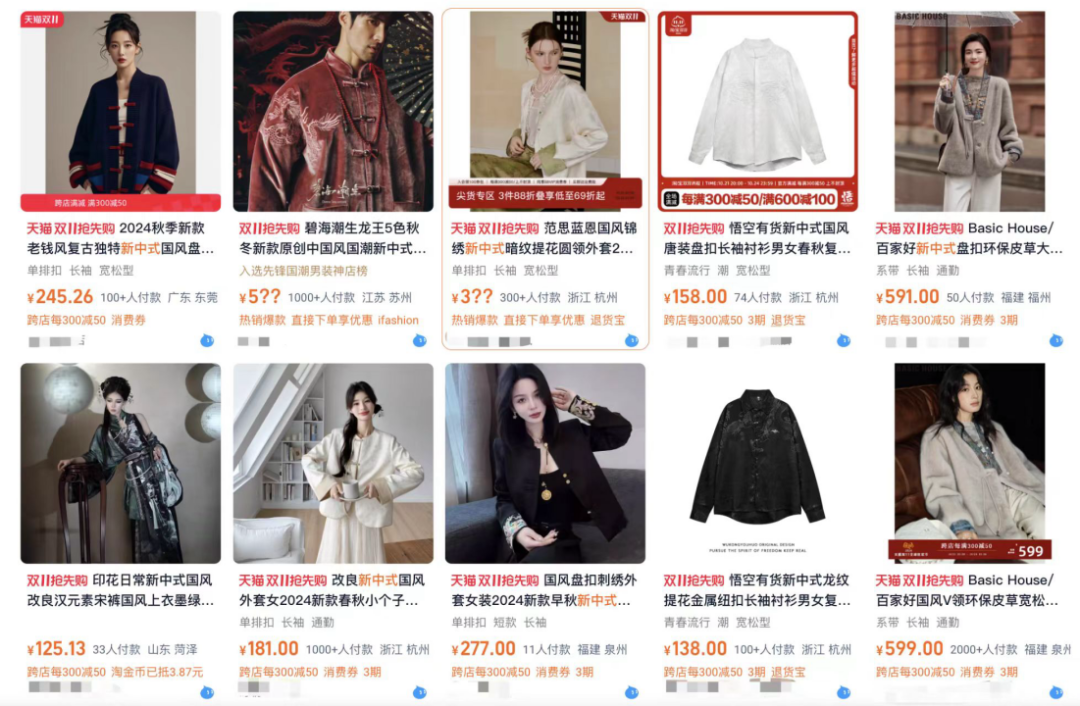事實上,“新中式”服裝概念尚未達成共識,“新中式”的“新”,并非代表時間刻度,而是強調(diào)風格樣式的創(chuàng)新。從廣義來說,將中華傳統(tǒng)元素與現(xiàn)代時尚設(shè)計融合的服飾,都可以被歸類為“新中式”。與傳統(tǒng)中式服裝相比,“新中式”服裝品類更加豐富:在保留傳統(tǒng)樣式的基礎(chǔ)上,融合西裝、羽絨服、連衣裙等現(xiàn)代服飾的版型。