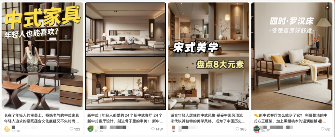 家居市場也是“新中式”消費風潮發(fā)展最為自然的領(lǐng)域。根據(jù)千瓜數(shù)據(jù)的調(diào)查顯示,2023年“新中式家居”的流量持續(xù)增長,在小紅書的相關(guān)種草筆記數(shù)增長超63%,月均互動達百萬級,新中式家具市場也在不斷成熟,除了木質(zhì)家具外,其他品類如“壁紙、地毯、床墊”等品類的種草筆記數(shù)或互動量增長也超300%。