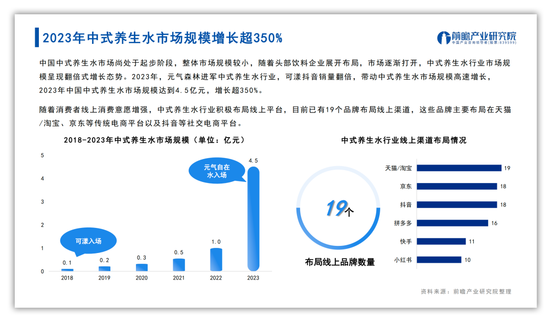 在現(xiàn)制茶飲行業(yè)以及便利店商超,以天然草本植物、水果或藥材為原料,通過煮制、萃取等工藝制成的“中式養(yǎng)生水”也開始刷存在感。根據(jù)前瞻產(chǎn)業(yè)研究院發(fā)布的《2024年中國中式養(yǎng)生水行業(yè)發(fā)展趨勢洞察報告》顯示,2023年中國中式養(yǎng)生水市場規(guī)模達到4.5億元,同比增長超過350%,預(yù)計至2028年可達到破百億元規(guī)模。