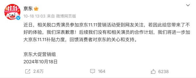 京東邀請以“冒犯男性”著稱的楊笠參加雙十一營銷活動,顯然觸怒了大量男性消費(fèi)群體,他們紛紛在京東店鋪、社交平臺上表達(dá)自己的不滿,還疑似引發(fā)了退款退會員等抵制行為。對于“請錯”代言人,有人質(zhì)疑京東故意炒作,也有人罵京東此舉“雞賊”,既想要流量,又不愿承擔(dān)被反噬的結(jié)果。