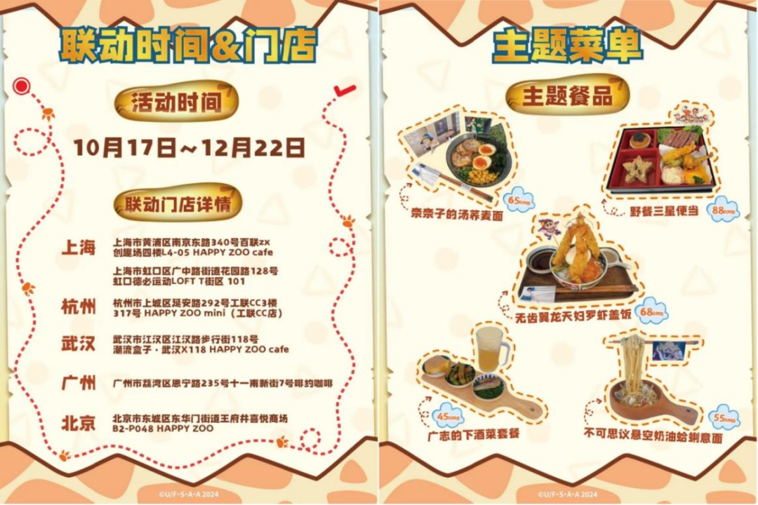 根據(jù)不同聯(lián)名主題,HAPPYZOO會(huì)進(jìn)行不同的風(fēng)格元素展示,配上主題餐飲系列,同時(shí)在店內(nèi)售賣主題周邊。據(jù)官方公眾號(hào)信息,HAPPYZOO已經(jīng)與全職高手、蠟筆小新、羅小黑等知名IP開出過聯(lián)名店。