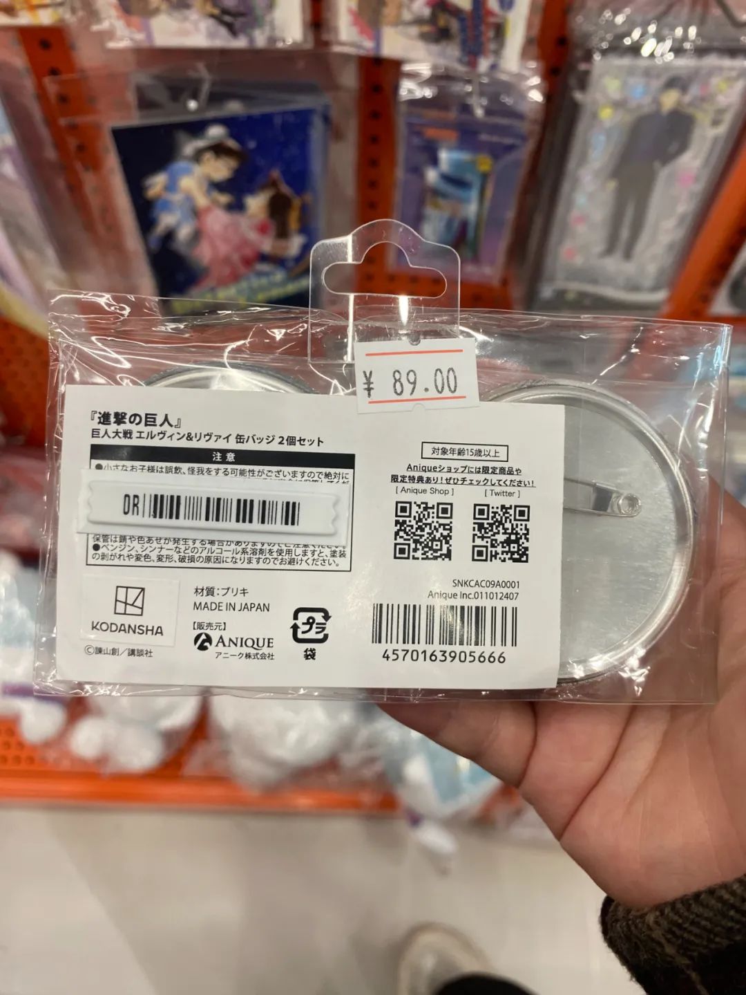 在湖濱88的谷子店中,徽章多在15-20元之間!叭展取,即在日本發(fā)售的正版周邊價(jià)格往往更高,例如在某個(gè)谷子店中售賣的《進(jìn)擊的巨人》雙徽章價(jià)格為89元,單個(gè)將近45元,比其他徽章價(jià)格高出一大截。