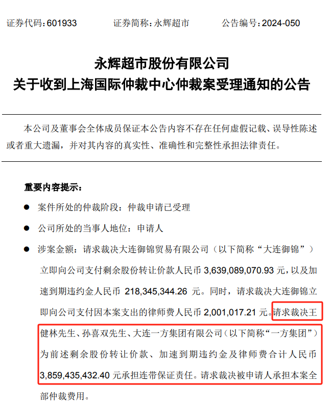 據(jù)披露,永輝超市請(qǐng)求裁決大連御錦立即向公司支付剩余股份轉(zhuǎn)讓價(jià)款約36.39億元,以及加速到期違約金約2.18億元;