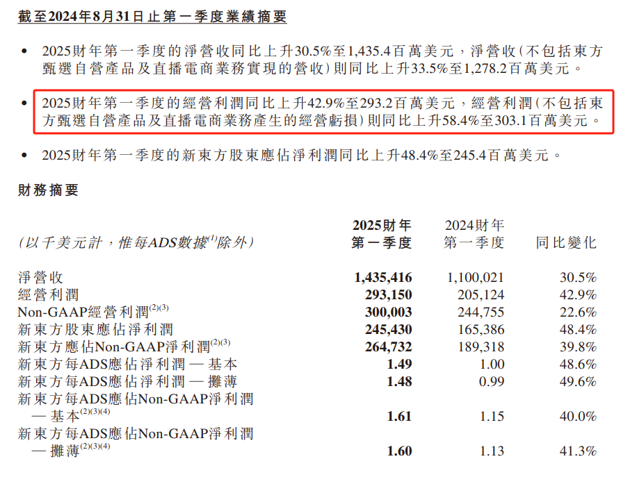 若不考慮東方甄選自營產(chǎn)品及直播電商業(yè)務(wù)產(chǎn)生的經(jīng)營虧損,則經(jīng)營利潤為3.03億美元,同比上升58.4%。