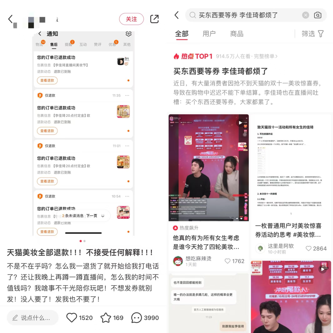 天貓美妝這邊,大量消費者因為搶不到天貓雙11美妝驚喜券導致在購物中遲遲不能下單結算,以至于“買東西要等券 李佳琦都煩了”登上小紅書10月24日的熱點TOP1。
