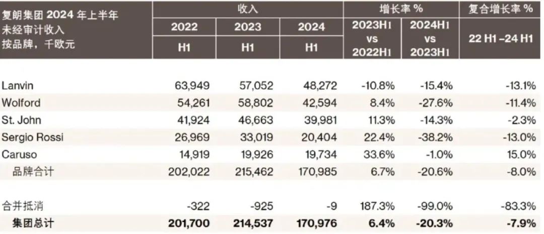 2024年上半年,復(fù)朗集團(tuán)營(yíng)收同比下滑20%至1.71億歐元,大中華區(qū)下降24%;Lanvin、Wolford和Sergio Rossi營(yíng)收也分別下滑15.4%、27.6%和38.2%,只有Caruso下滑1%。