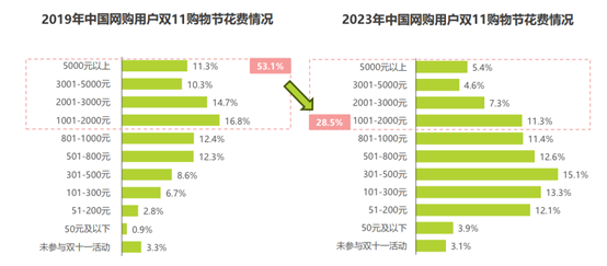 艾瑞咨詢披露的數(shù)據(jù)顯示,2019年,在雙11購物節(jié)中花費(fèi)超1000元的網(wǎng)購用戶占比為53.1%,而到了價(jià)格戰(zhàn)異常激烈的2023年雙11,此類網(wǎng)購用戶占比大幅下降至28.5%。