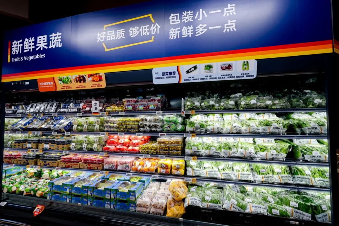 一進(jìn)店門,映入眼簾的就是蔬菜和水果。相比于其他門店,金山首店大大增加了生鮮陳列面積,蔬菜、鮮肉、奶蛋、冷凍速食、糧油、飲料(水)等占據(jù)了絕大部分空間。