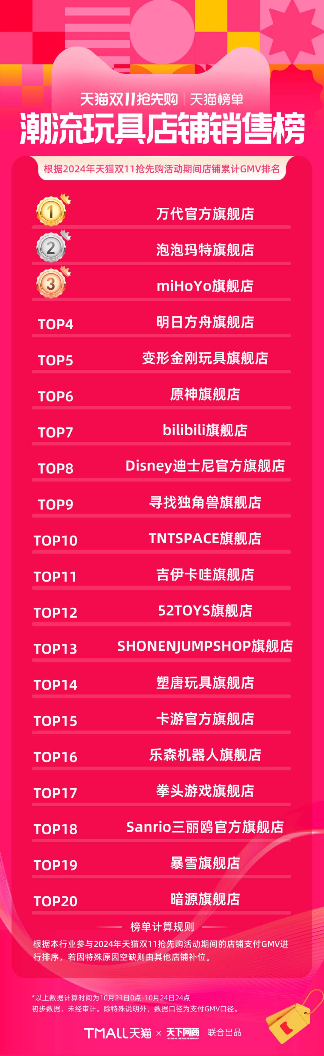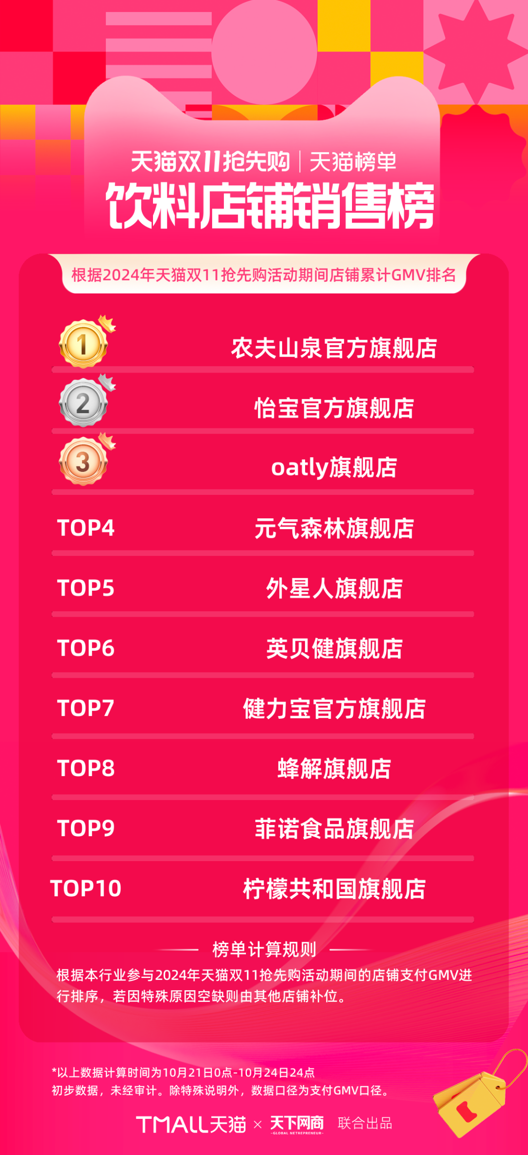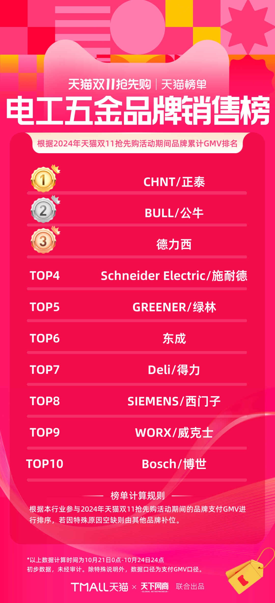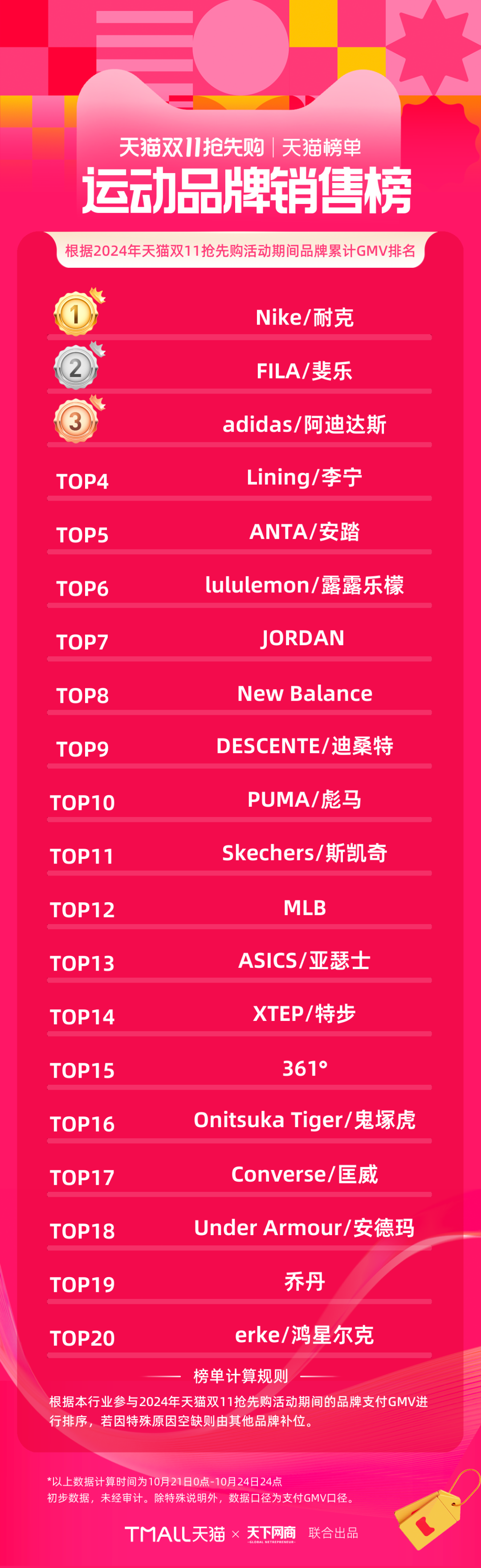 以下為《天下網(wǎng)商》聯(lián)合天貓發(fā)布的2024年天貓雙11第一階段(10月21日-10月24日)品牌成交排行榜,祝賀商家們。