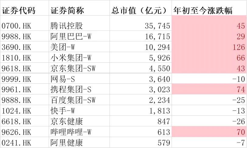但這一輪的行情完全不同2020年的雞犬升天下的行業(yè)普漲,分化相當(dāng)大。我們統(tǒng)計了恒生科技指數(shù)中市值前12名的互聯(lián)網(wǎng)公司,走出了明顯的分化。漲幅大的公司,股價上漲了50%以上,而不少公司,年初至今還是負(fù)收益。