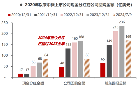 根據(jù)民生證券統(tǒng)計的全部中概上市公司股東回報數(shù)據(jù),可以看到在轉(zhuǎn)型之后的2021年開始,中國互聯(lián)網(wǎng)公司就開始了注重股東回報,2021年超出2020年1倍多,后續(xù)兩年繼續(xù)增長,而2024年僅上半年,股東回報就達(dá)到169億美元,已經(jīng)達(dá)到去年的72%。