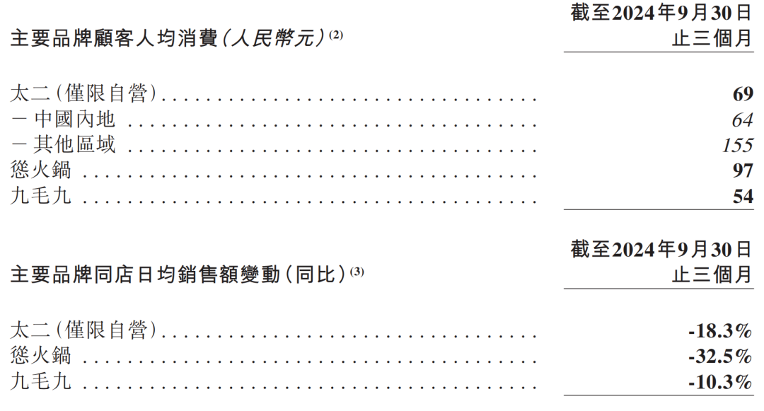 3、主要品牌的人均消費(fèi)和同店日均銷售額均有雙位數(shù)下滑。