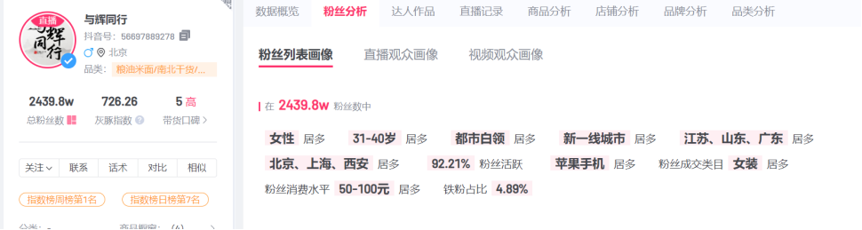 還有一個有意思的細節(jié)是,有第三方數(shù)據(jù)顯示,至今與輝同行和東方甄選的用戶畫像還高度相同。女性,31-40歲,可見即使分了家,兩個賬號所爭奪的還是同一個客戶群體,或者說與輝同行的很多客戶群就是原來關(guān)注東方甄選的客戶群。而未來董宇輝熱度逐步降低,直播電商運營進入深水區(qū)的時代,長期來看,如何建構(gòu)好商品供應鏈可能遠比頭部主播的形象維護要重要得多了。