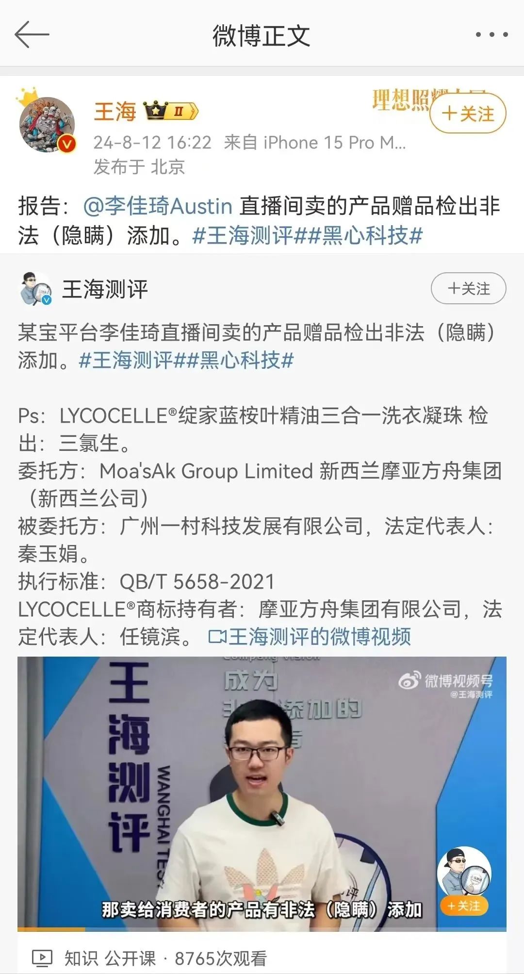 8月12日,王海發(fā)布微博稱,李佳琦直播間售賣的內(nèi)衣褲清洗液贈品洗衣凝珠檢出非法添加抗菌劑三氯生。資料顯示,三氯生在日化用品中常見,但在我國《化妝品技術(shù)規(guī)范》中被歸入防腐劑類物質(zhì),并有限制使用條件和范圍。目前,暫未找到李佳琦對此事的回應(yīng)。