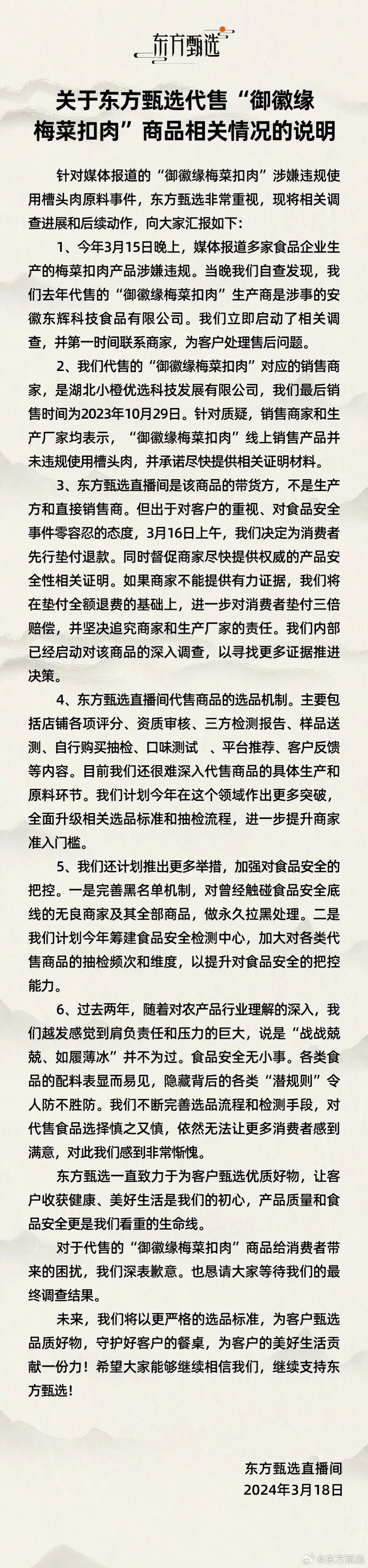 此外,他還爆料東方甄選銷售的自營厄瓜多爾南美白蝦隱瞞添加并超量使用蝦藥焦亞硫酸鈉。東方甄選當(dāng)時回應(yīng)稱,正在走報警流程,并強(qiáng)調(diào)產(chǎn)品原裝進(jìn)口、符合國家標(biāo)準(zhǔn)。