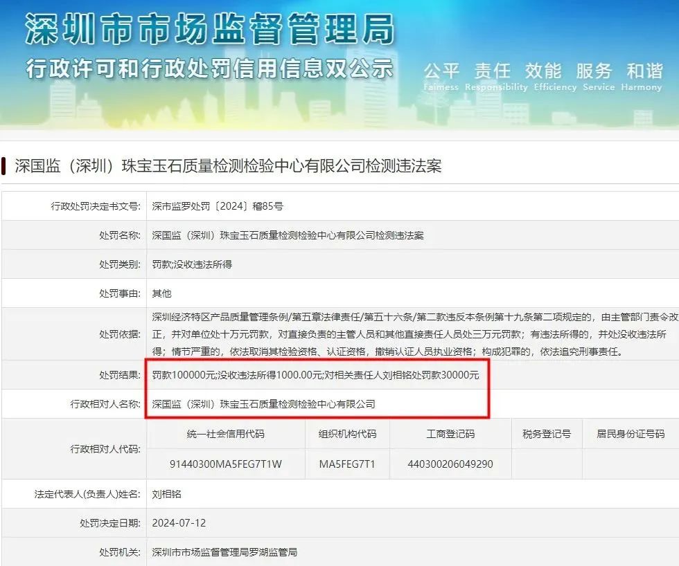 王海舉報后,深圳市市場監(jiān)督管理局回復(fù)稱,已對該出具假鑒定證書的公司做出責(zé)令整改及罰款10萬元、沒收違法所得1000元、對相關(guān)責(zé)任人罰款3萬元的行政處罰決定。