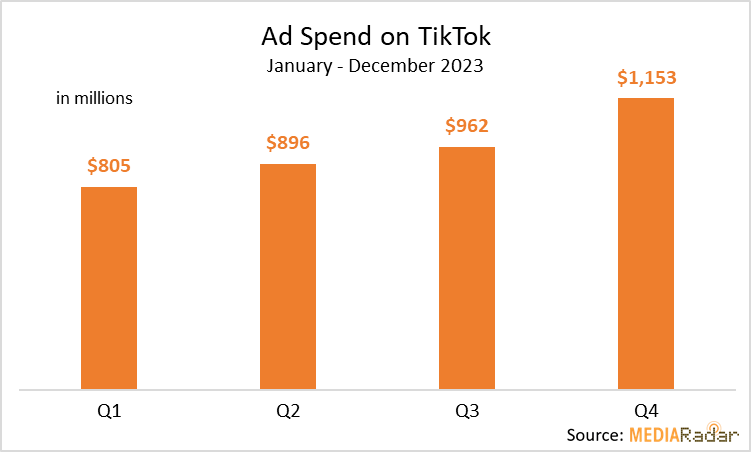 今年2月份,廣告情報(bào)公司Media Radar公布的最新數(shù)據(jù)顯示,去年第四季度,各大廣告商在TikTok上的廣告支出突破10億美元大關(guān),達(dá)到了11.53億美元,相較第一季度增長了43%。