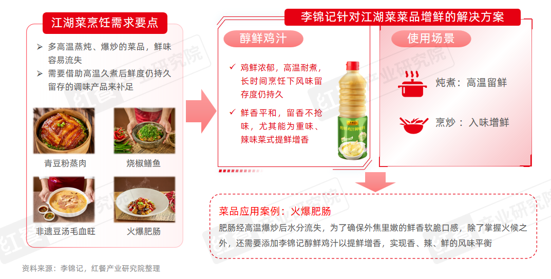 然而,江湖菜菜品在高溫蒸燉、爆炒的過(guò)程中,鮮味容易流失,需要借助高溫久煮后鮮度仍持久留存的調(diào)味產(chǎn)品來(lái)補(bǔ)足。為此,李錦記為江湖菜提出了菜品增鮮的解決方案,在江湖菜烹制過(guò)程中使用李錦記醇鮮雞汁新品,可保持菜品味型,不搶食材本味,同時(shí)起到提鮮增香的作用。比如火爆肥腸這道菜,肥腸經(jīng)高溫爆炒后水分流失,為了確保外焦里嫩的鮮香軟脆口感,除了掌握火候之外,還需要添加李錦記醇鮮雞汁以提鮮增香,實(shí)現(xiàn)香、辣、鮮的風(fēng)味平衡。