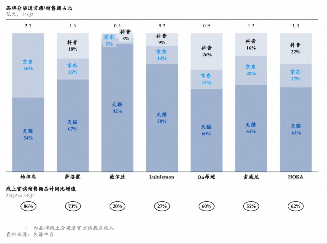 從久謙中臺的數(shù)據(jù)也可以看出,天貓貢獻了絕大部分的線上直營銷售額,Salomon、昂跑、Hoka、索康尼的天貓旗艦店都貢獻了超過60%的線上官旗銷售額,對于lululemon和Wilson(威爾勝)而言,線上銷售額天貓貢獻率更是遠遠超過其他渠道的總和。