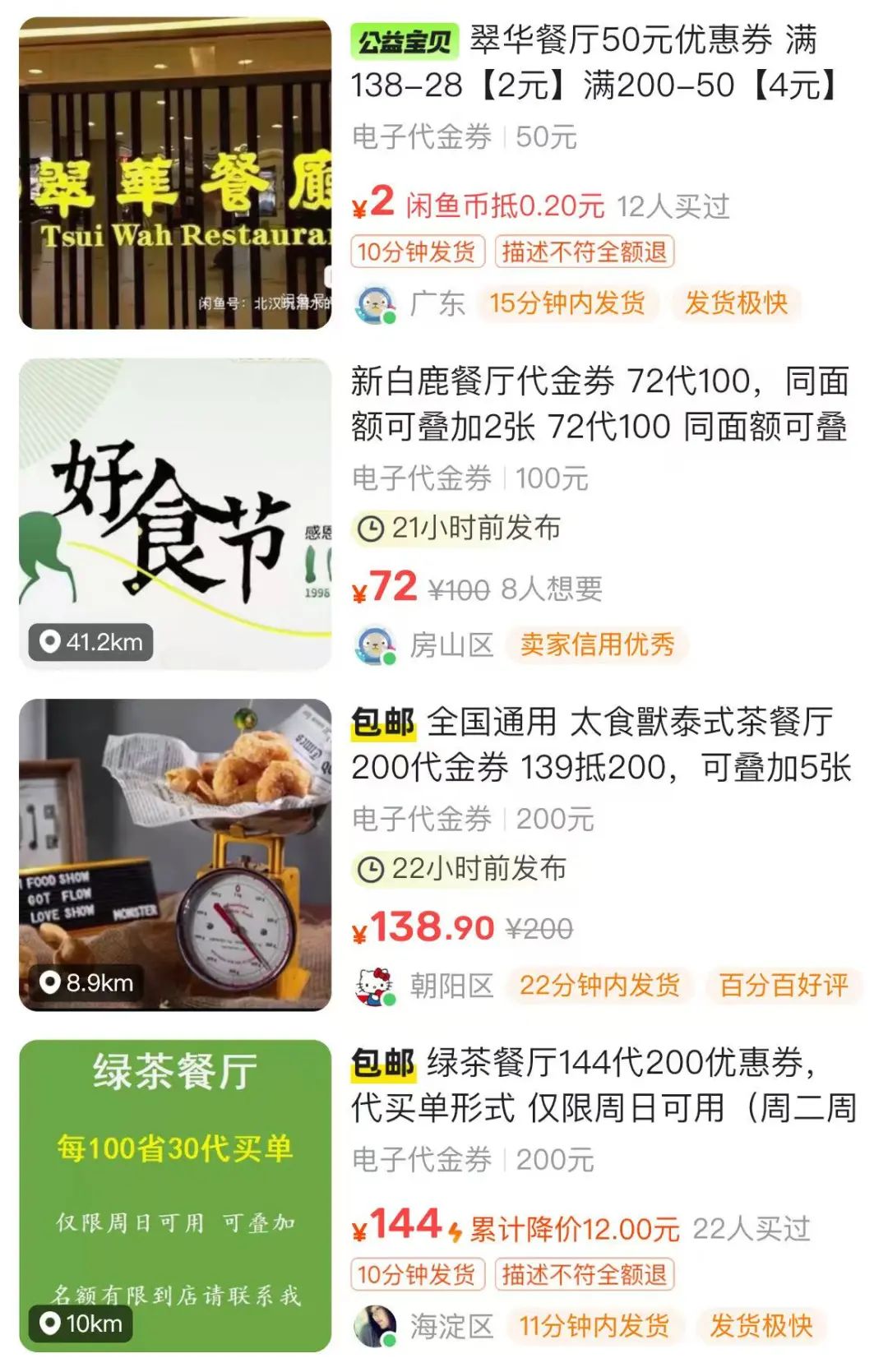 在省錢的江湖,早已流傳著閑魚的傳說(shuō)。用完閑魚買電影票,從此貓眼是路人,原價(jià)80的萬(wàn)達(dá)電影票找閑魚代購(gòu)直接水靈靈的變成40元。6折買星巴克、7折吃火鍋,在閑魚買過(guò)吃喝卡券后瘋狂星期四都沒(méi)那么瘋狂了。消費(fèi)者分兩種,用過(guò)閑魚的還沒(méi)用過(guò)閑魚的,后者打開省錢新世界的大門——“便宜得我都感覺有點(diǎn)對(duì)不起商家了”。