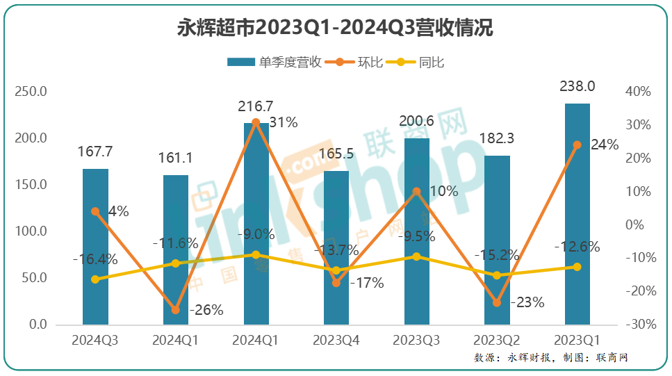 10月30日傍晚,永輝超市發(fā)布2024年第三季度報告。報告期內公司實現(xiàn)營業(yè)收入167.70億元,同比下降16.40%;歸屬于上市公司股東的凈利潤為-3.53億元。