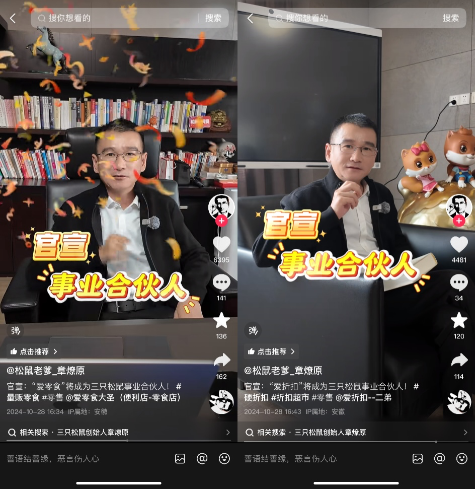 三只松鼠章燎原連發(fā)兩條視頻表示,“愛零食”“愛折扣”將成為三只松鼠事業(yè)合伙人,共同促進量販零食行業(yè)的健康發(fā)展。